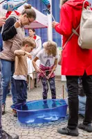 Stánek Lázně Poděbrady, a.s. a Léčebny Dr. Filipa: prodej triček na pochod a odznáčků, hry pro děti, drobné dárečky, balónky, malování na obličej